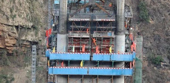3月15日,四川金阳河特大桥桥墩上,工人正在进行施工,大桥建设稳步推进。金阳河特大桥位于四川省凉山彝族自治州金阳县县城以北,起于城东绕城公路上,止于县城对岸木腊沟,与国道G356线改建公路和规划的金阳新区城市道路相连接。金阳河特大桥桥跨布置为(19.38+3×22米)预应力现浇箱梁 +(106+2×200+115+40)米连续刚构,主桥长661米,全桥长757.7米,桥梁宽度16米。共有9个桥墩,其中最高的6号主桥墩高达196米,位居同类型墩柱世界第一。